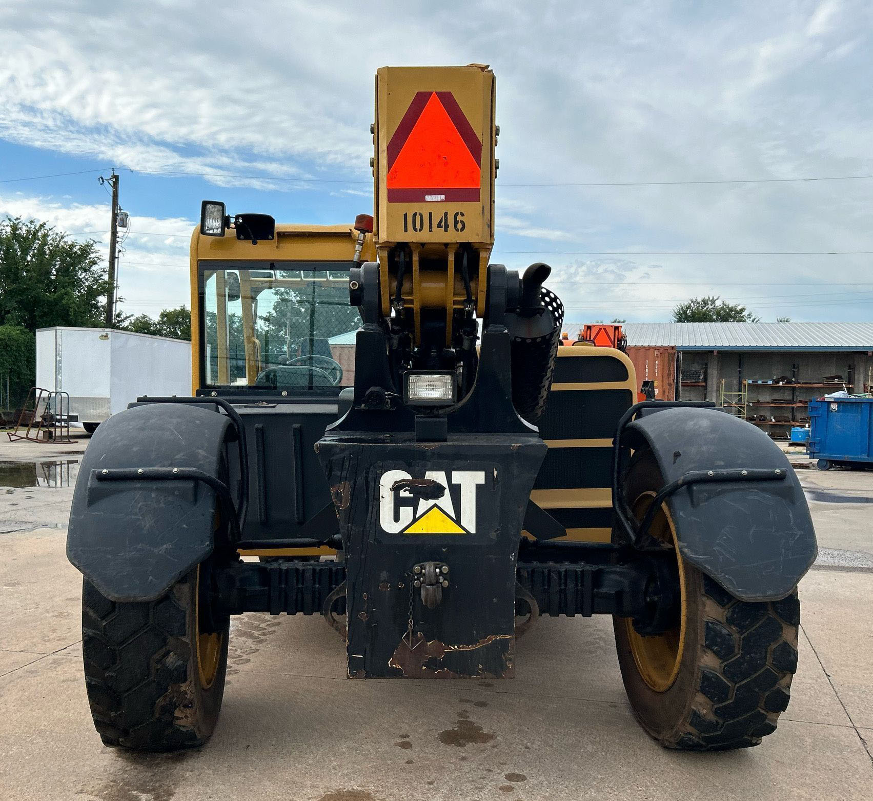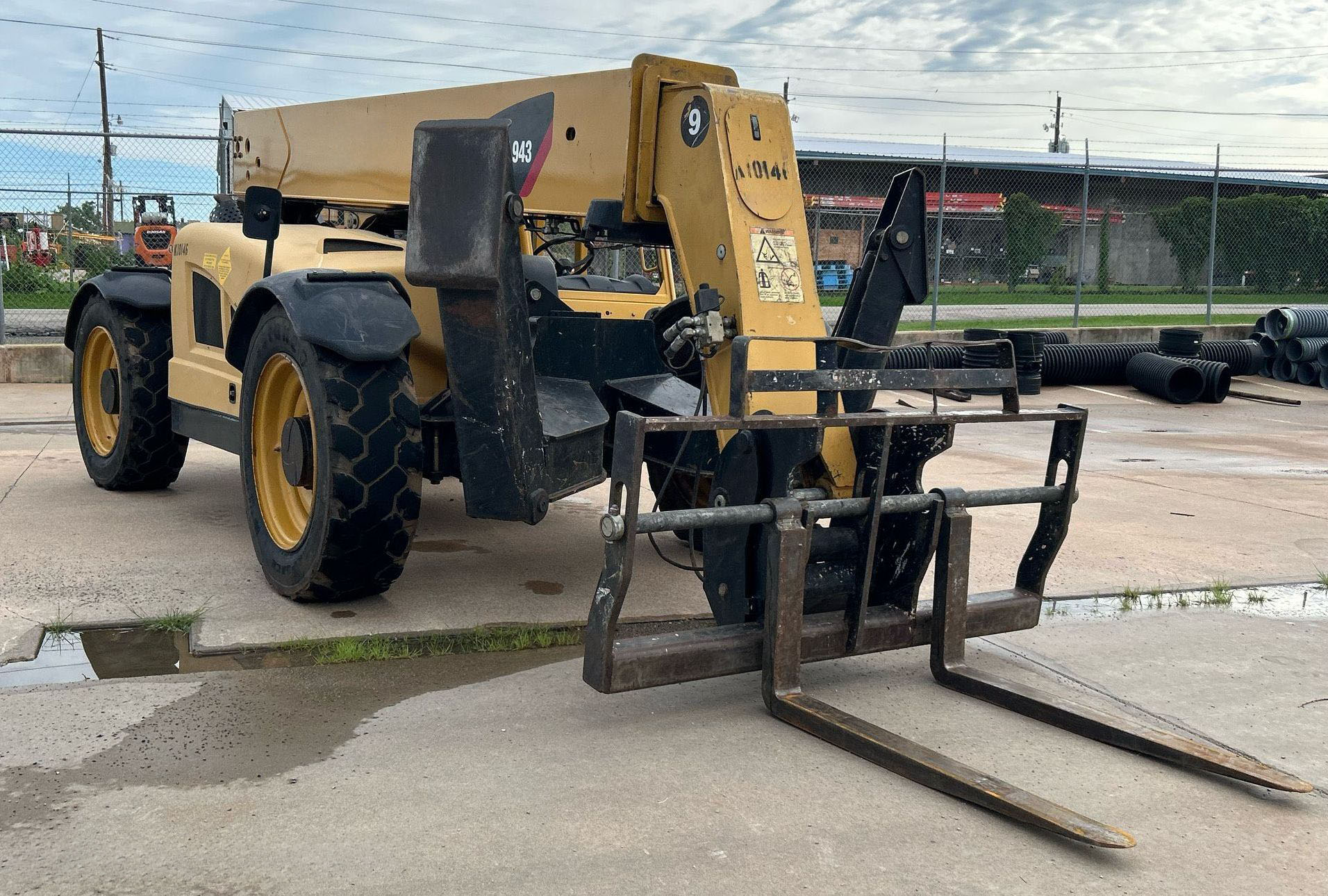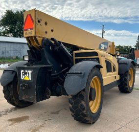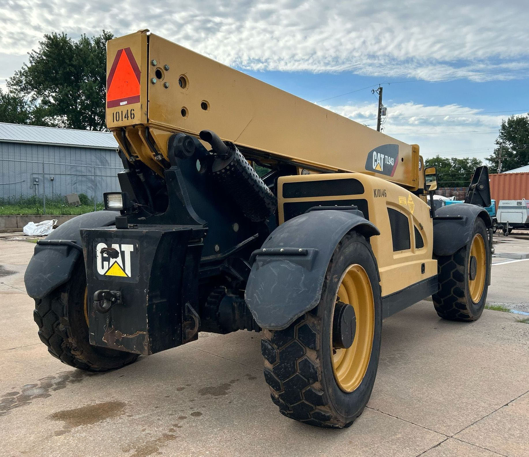 2012 Caterpillar TL943 telehandler with 3,108 hours. Powered by a 4.4L Caterpillar C4.4 Acert diesel engine and powershift transmission with 4F - 4R, four-wheel drive. Features a canopy, crab and four-wheel steering, auxiliary hydraulics, hydraulic outriggers, and hydraulic leveling. Maximum lift capacity of 9,000 lbs and maximum lift height of 43'. Equipped with 48" fork length and 370.75-28 tires.
