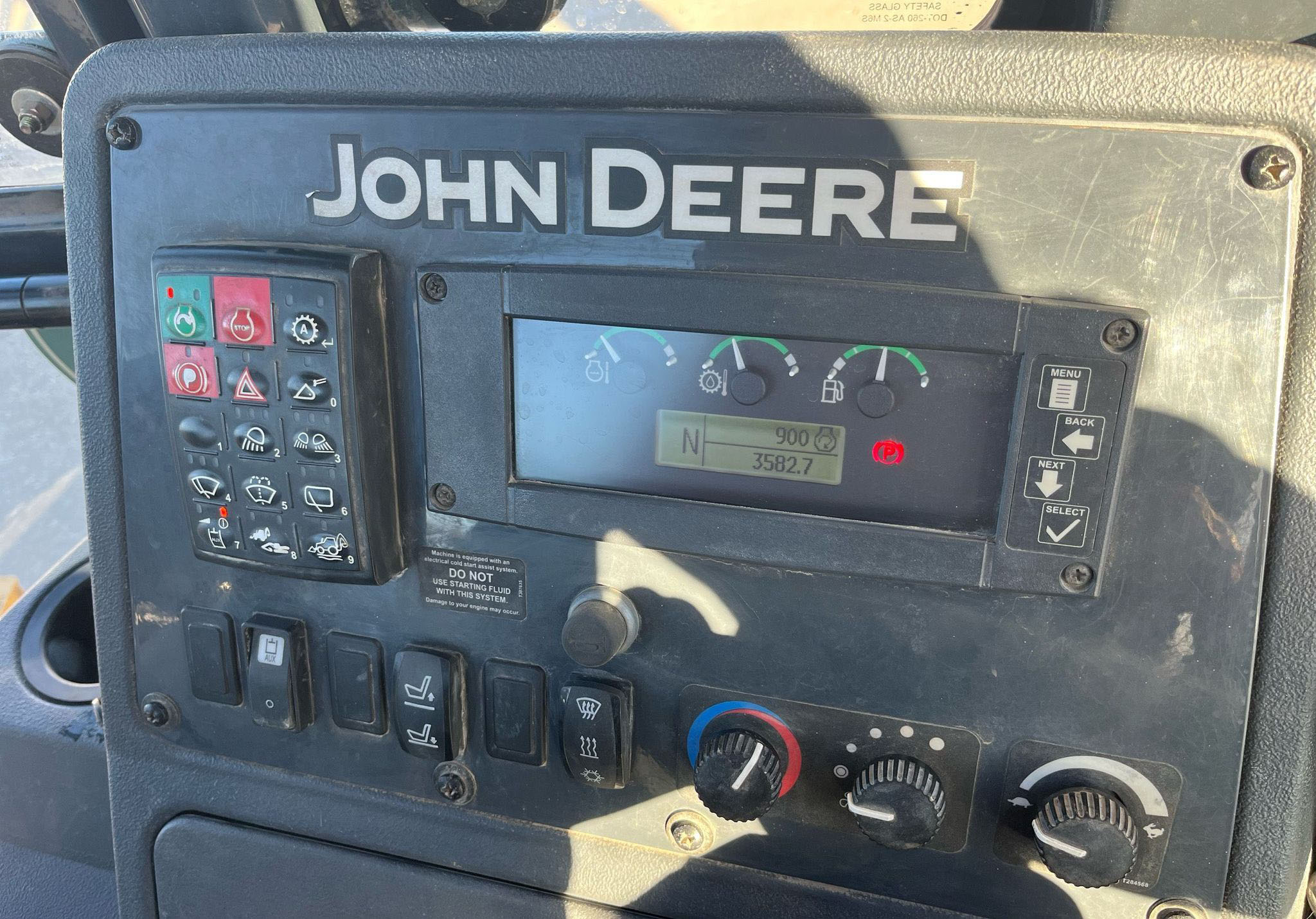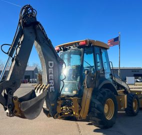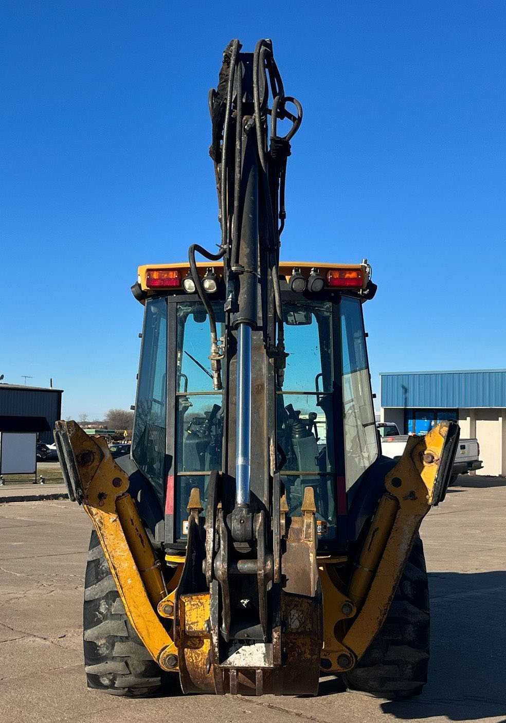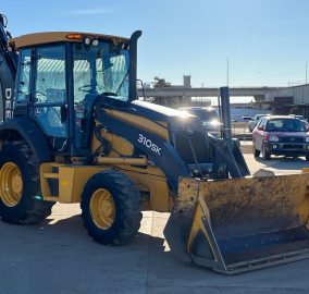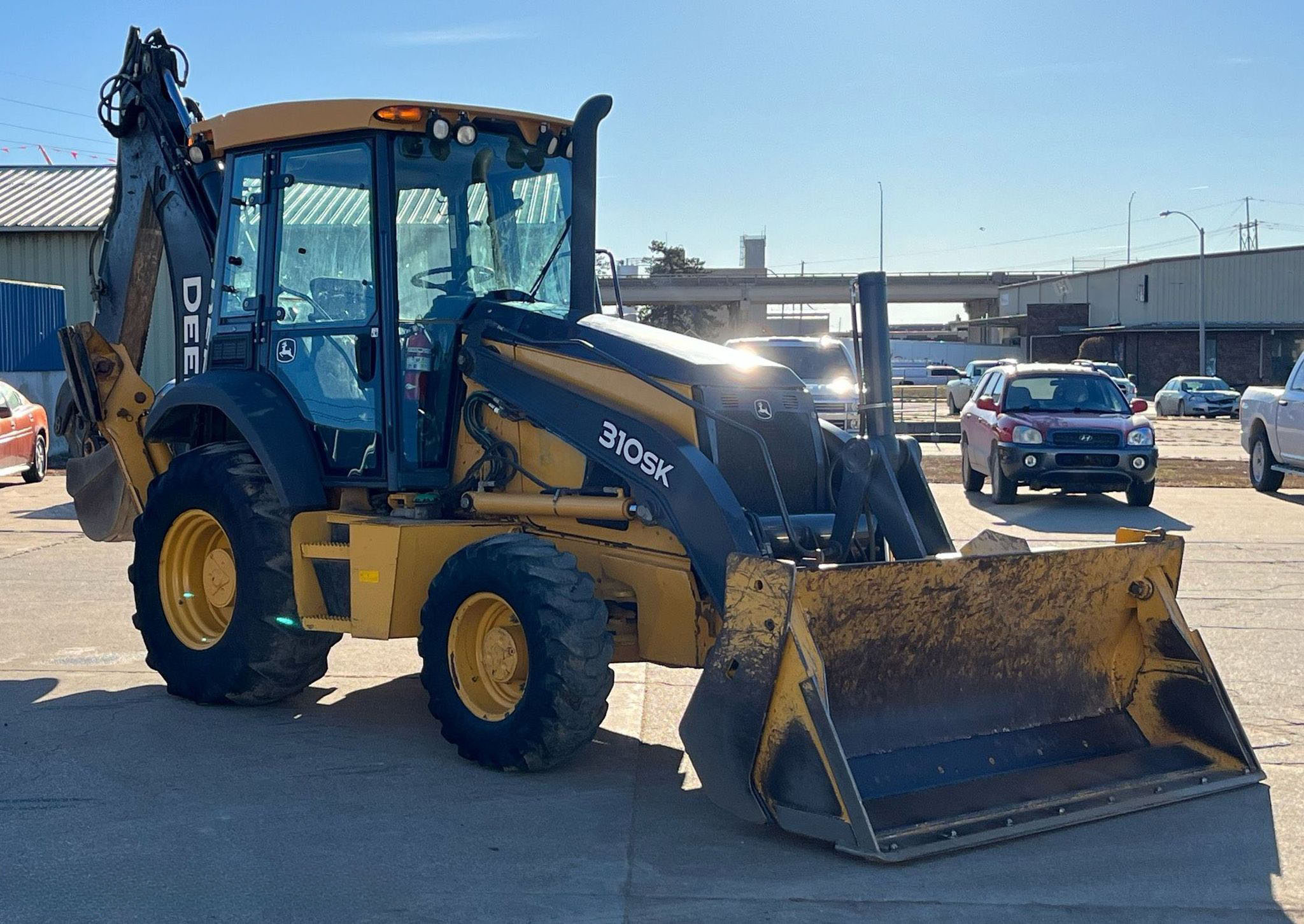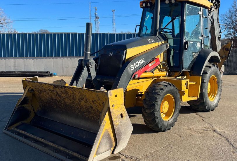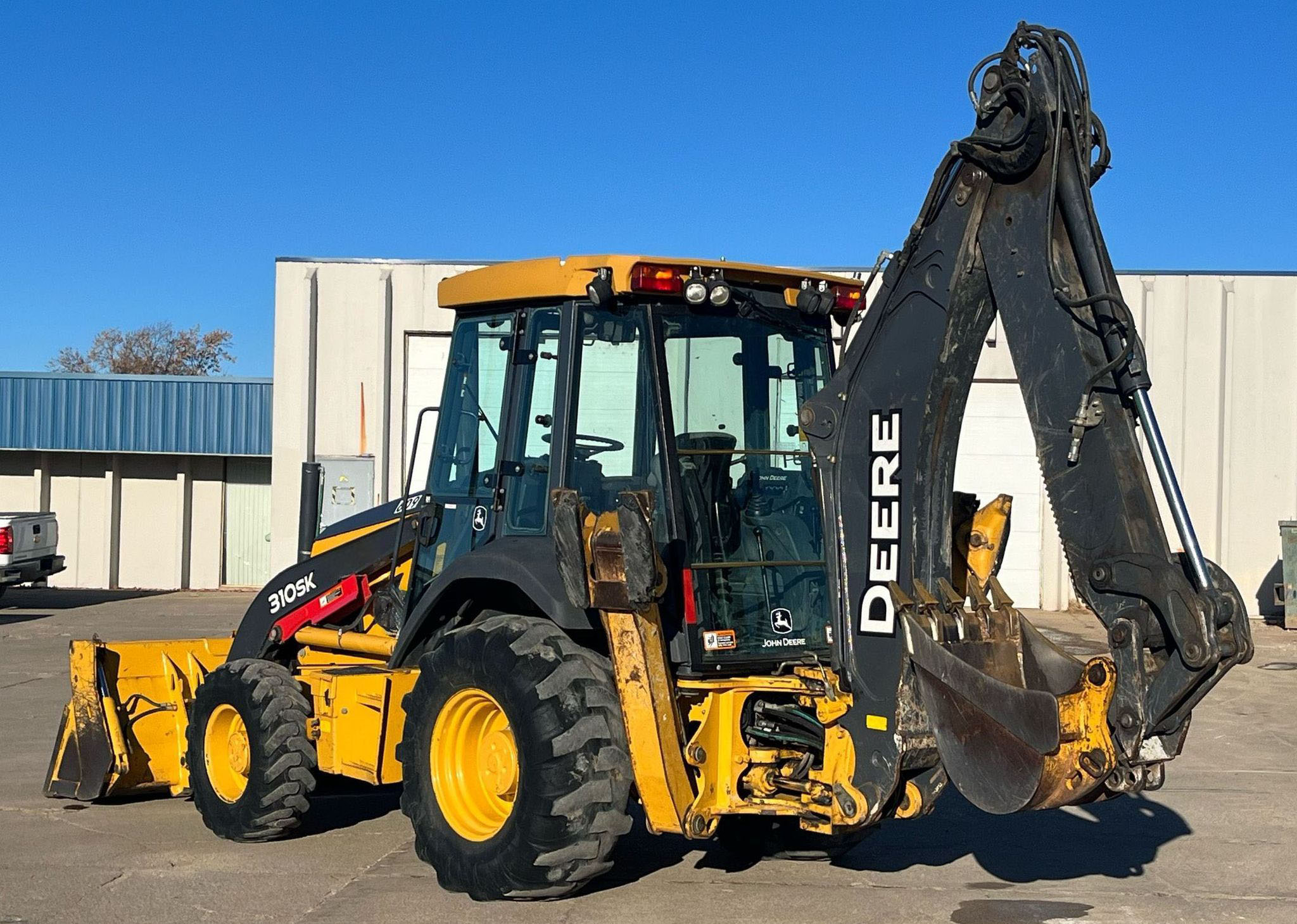 2013 John Deere 310SK backhoe with 3,582 hours. Powered by a 4-cylinder diesel engine and equipped with a powershift transmission (4F-4R) and four-wheel drive with differential lock. Features an enclosed cab with AC and heat, pilot-controlled backhoe with pattern changer, and a four-in-one loader bucket (91" wide with bolt-on cutting edge). The backhoe includes an extendable stick, manual quick coupler, and a 24" bucket with 5 teeth. Tires are 12.5/80R18 in the front and 19.5L-24 in the rear.