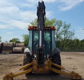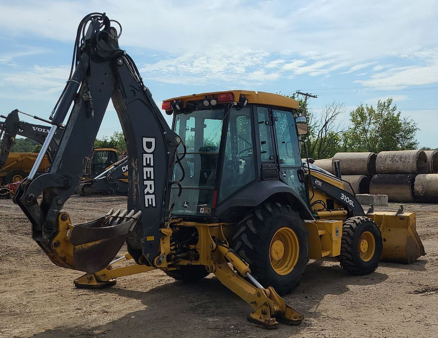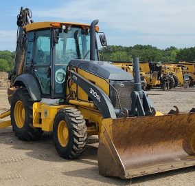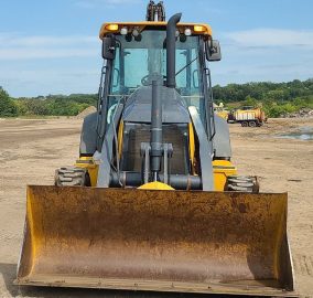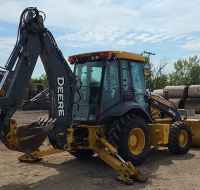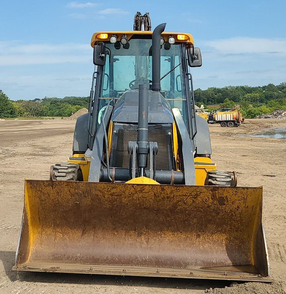 2016 John Deere 310SL backhoe with 2,753 hours. Powered by a 4-cylinder diesel engine and equipped with a powershift transmission (4F-4R) and four-wheel drive with differential lock. Features an enclosed cab with AC and heat, pilot-controlled backhoe, and a 92" loader bucket with a bolt-on cutting edge. The backhoe includes an extendable stick, auxiliary hydraulics, and a 24" bucket with 5 teeth. Tires are 12.5/80R18 in the front and 29.5-24 in the rear.
