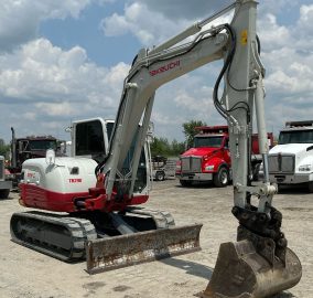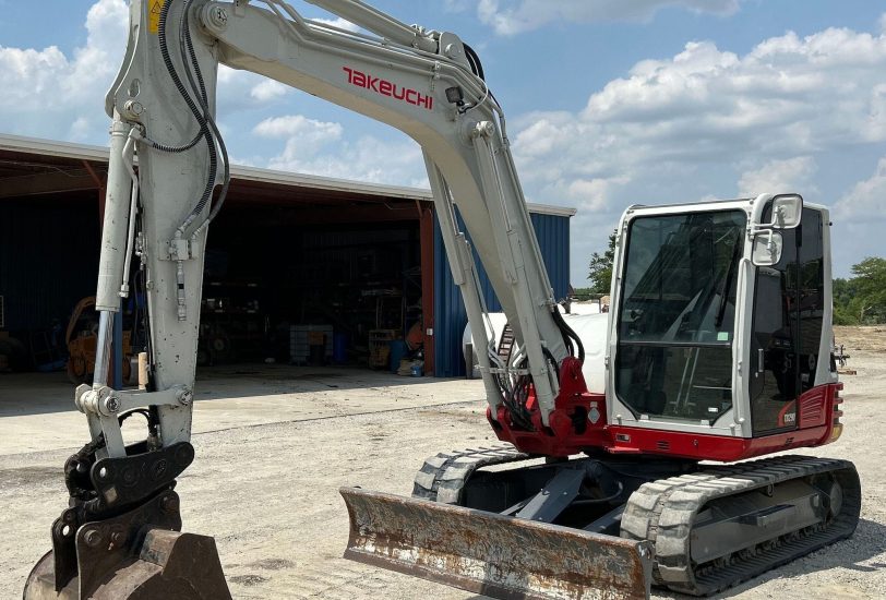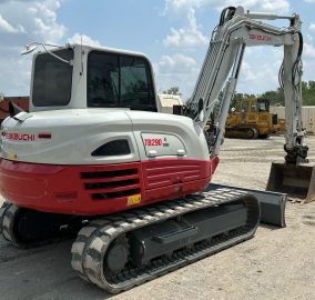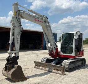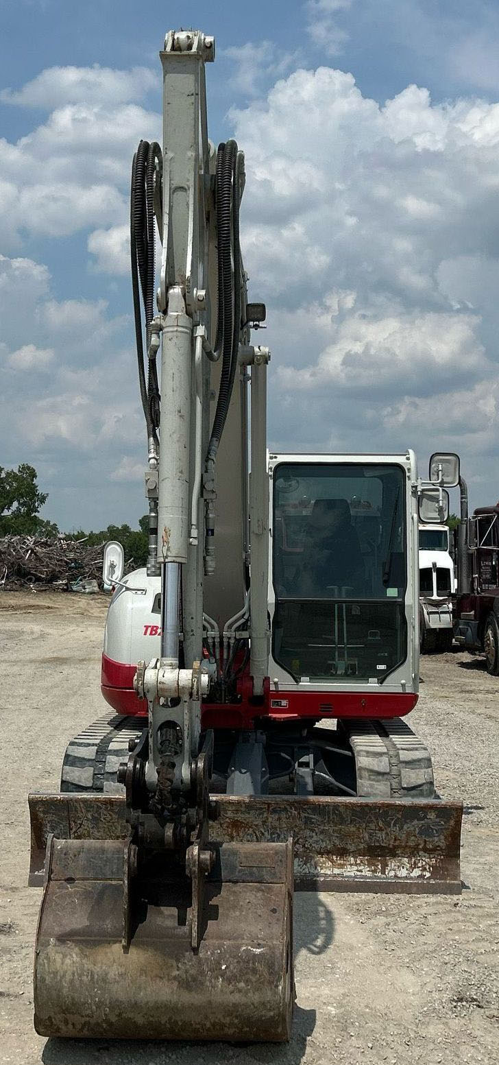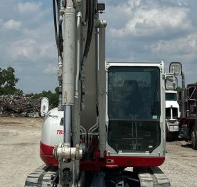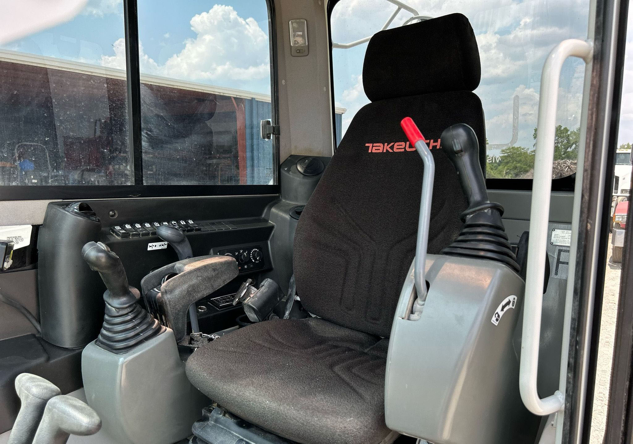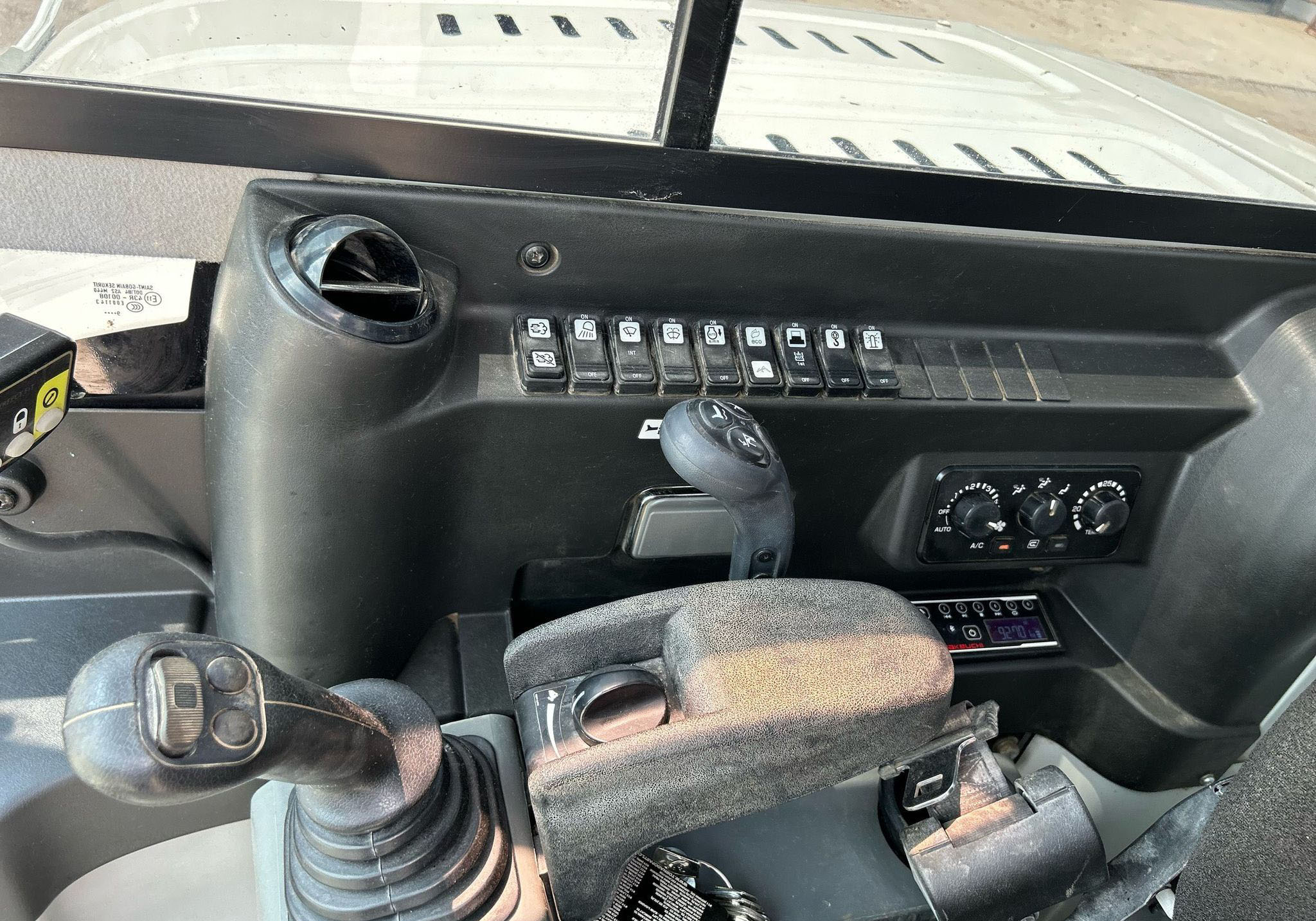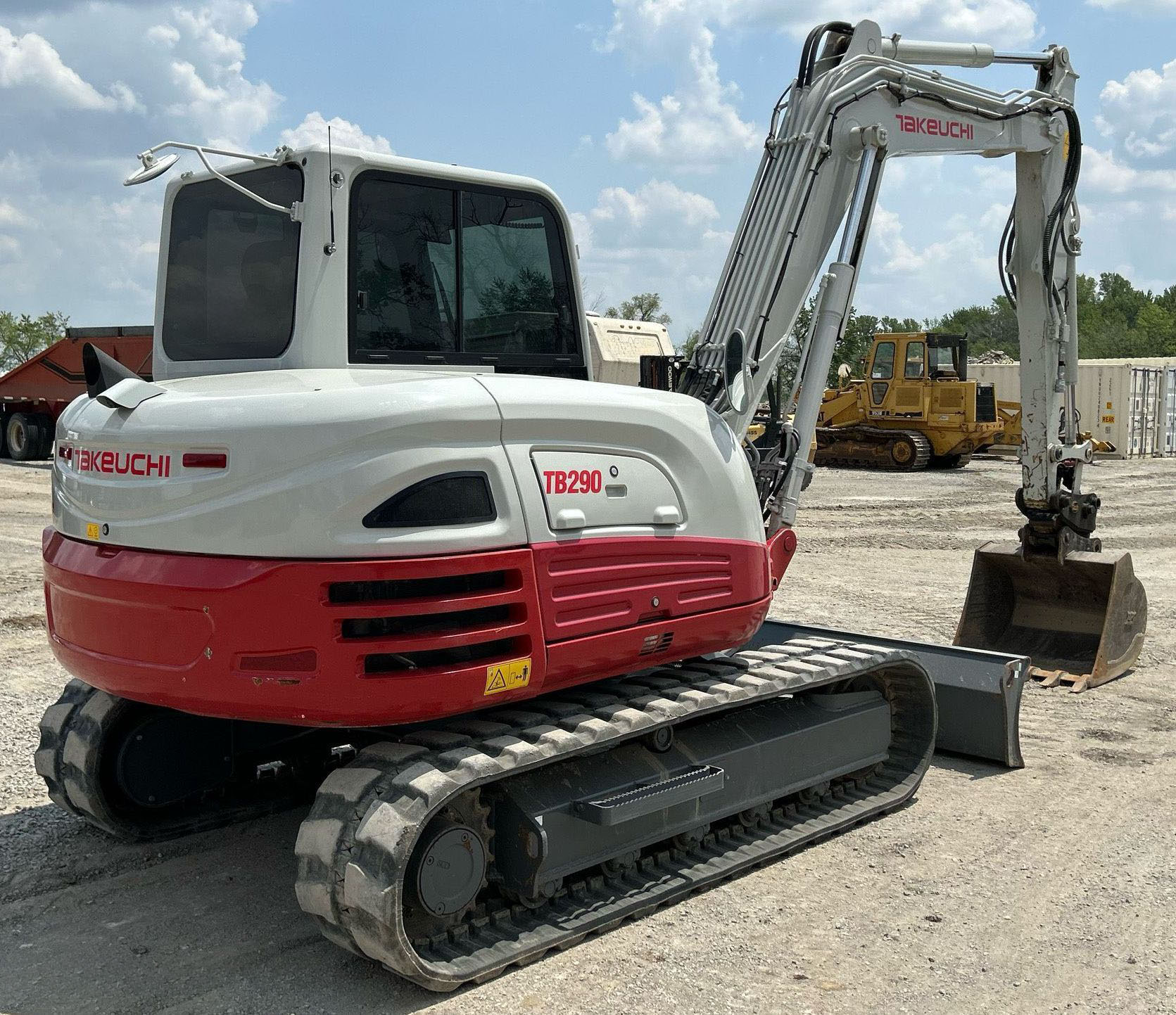 The 2020 Takeuchi TB290 mini excavator is powered by a 4-cylinder Yanmar diesel engine with 1,144 hours. It features a hydrostatic transmission with two-speed travel, EROPS with AC and heat, and auxiliary hydraulics. The machine includes a hydraulic quick coupler, a 35" Geith bucket with 6 teeth, and an 18" TAG bucket with 4 teeth. It has a 7' stick, backfill blade, and 17" rubber tracks. A versatile, compact machine ideal for various digging and lifting tasks.