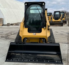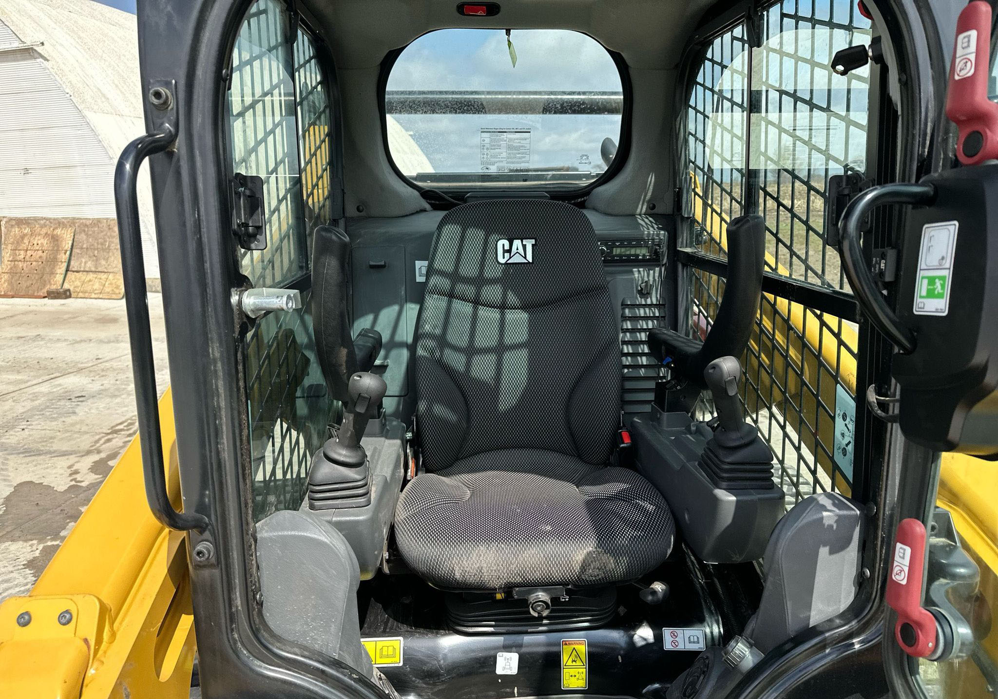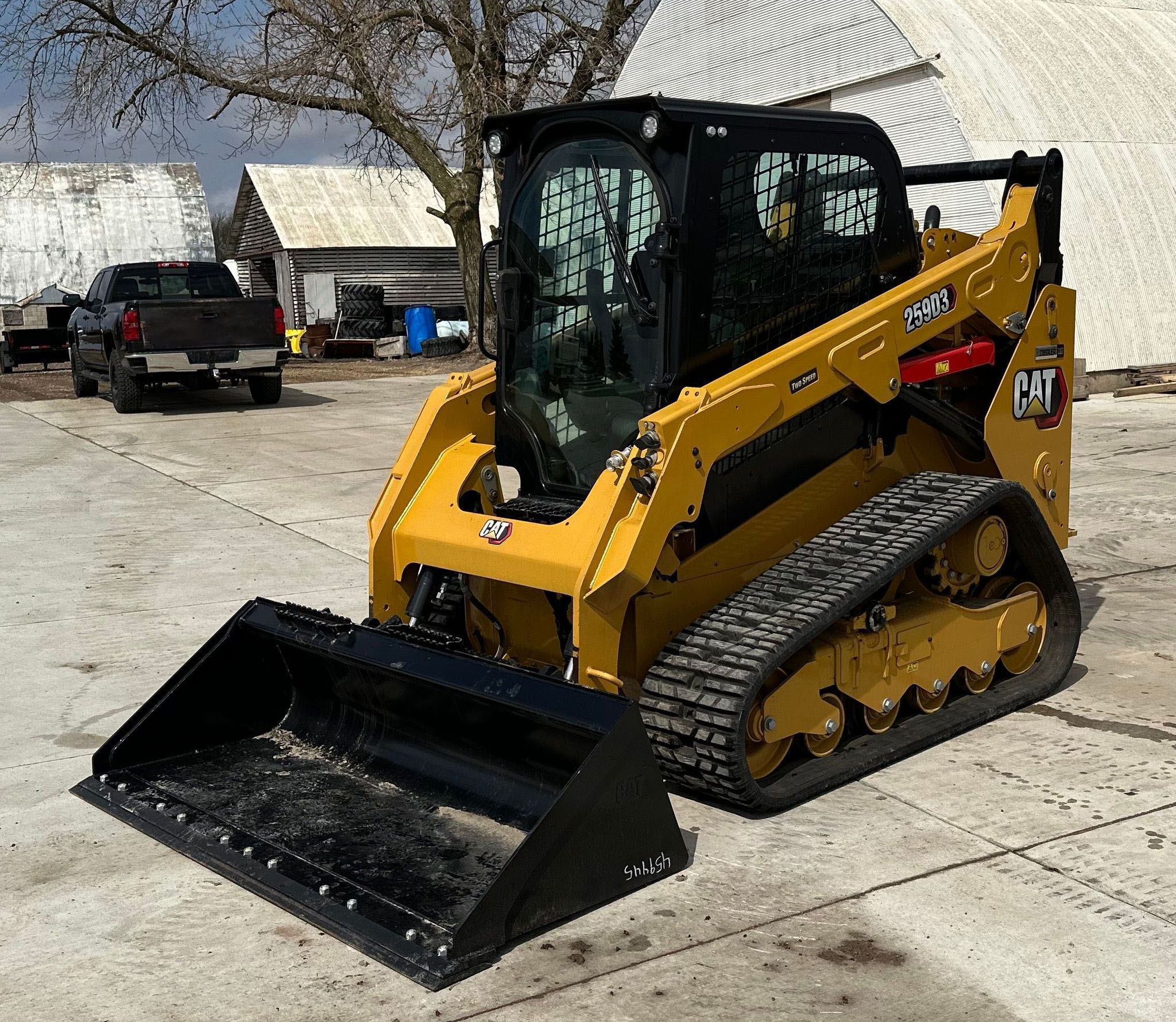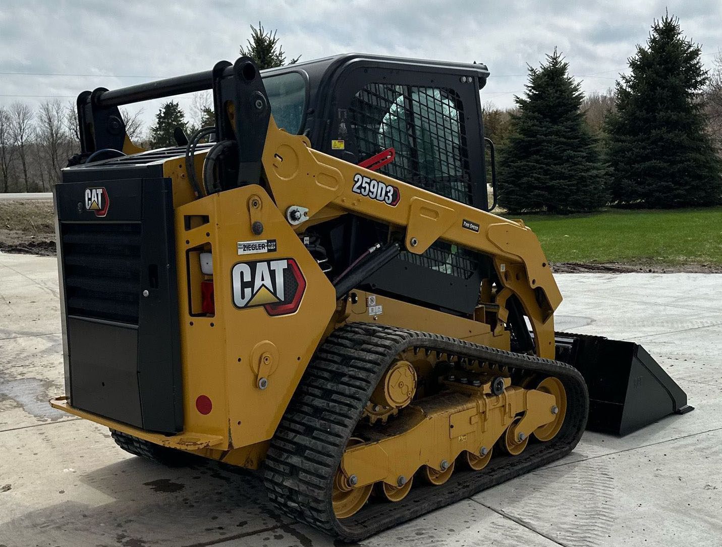 2022 Caterpillar 259D3 tracked skid steer loader with only 29 hours. Powered by a 54.6 kW Caterpillar C3.3B 4-cylinder diesel engine and hydrostatic transmission with two-speed travel. Features EROPS with AC and heat, hand-operated bucket control, and an electronic monitoring system. Equipped with auxiliary hydraulics, auxiliary electrical outlet, and a hydraulic quick coupler. Includes a 0.57 cu.yd. Caterpillar bucket (73" wide, bolt-on cutting edge) and 15.5" wide Caterpillar tracks.