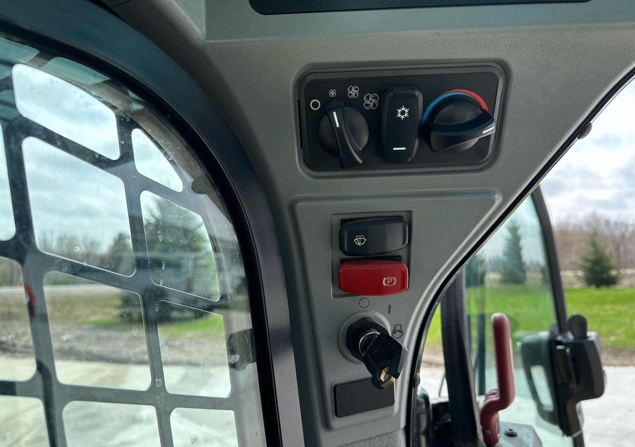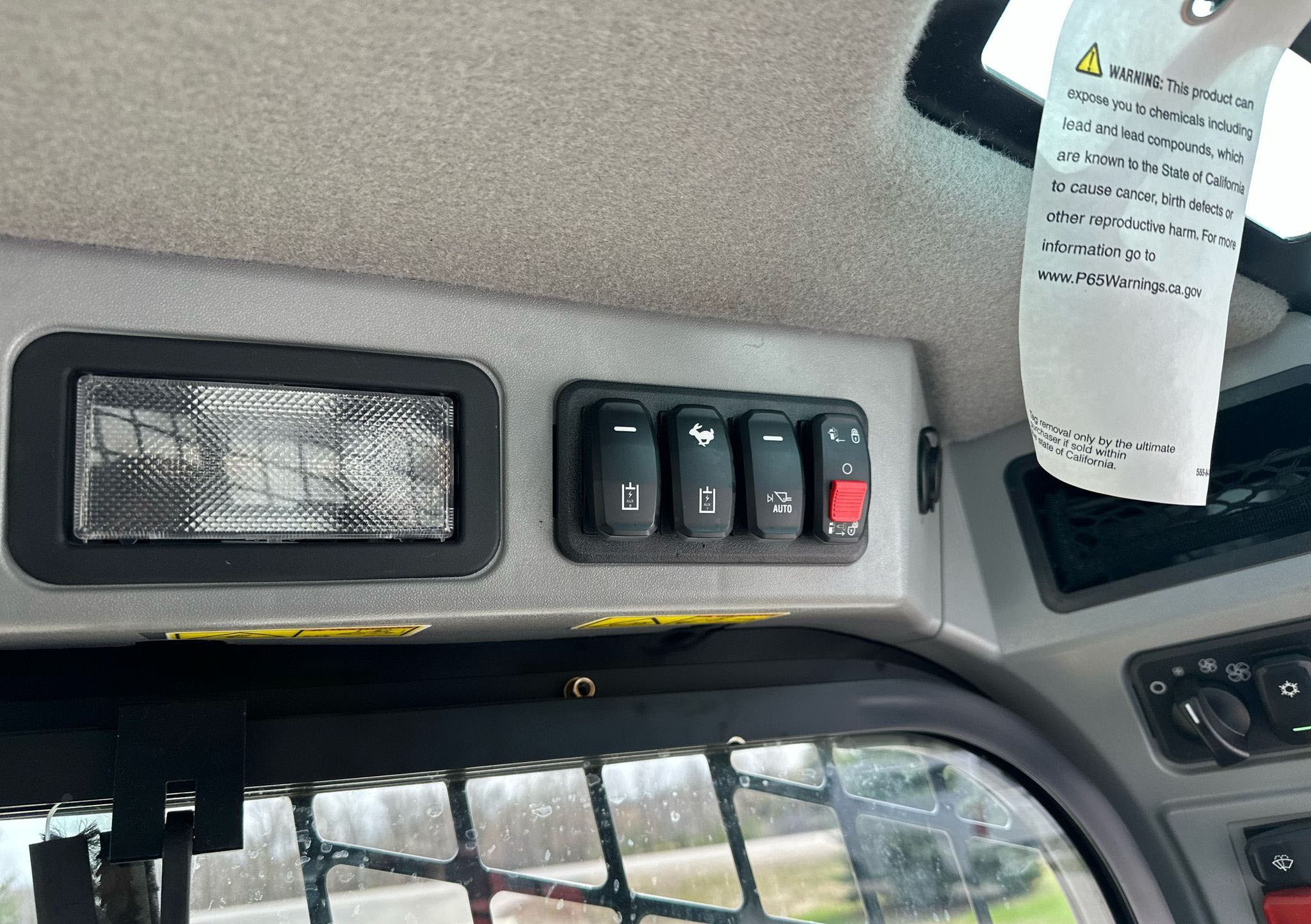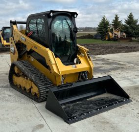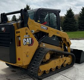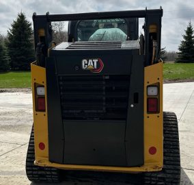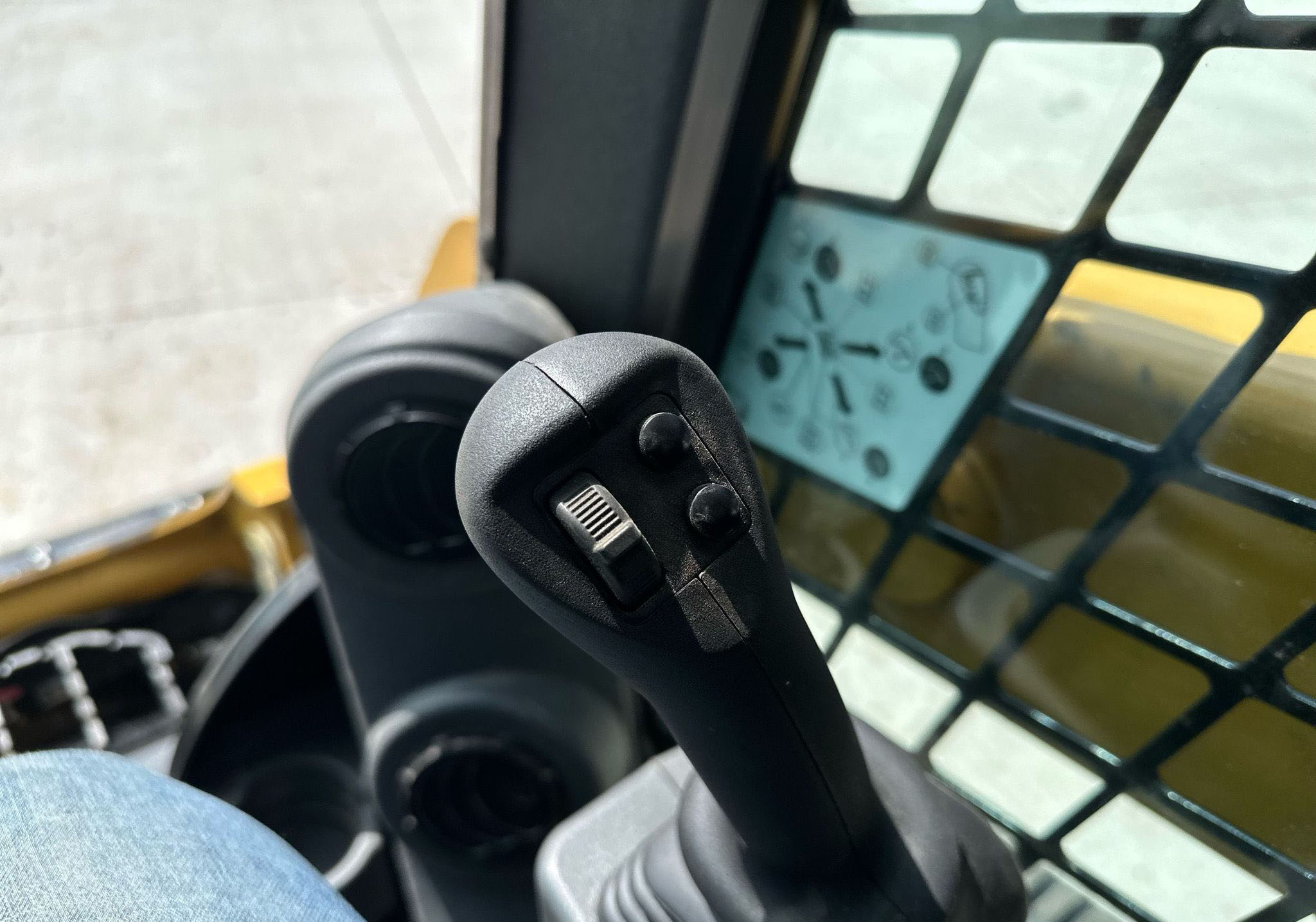 2022 Caterpillar 259D3 tracked skid steer loader with only 29 hours. Powered by a 54.6 kW Caterpillar C3.3B 4-cylinder diesel engine and hydrostatic transmission with two-speed travel. Features EROPS with AC and heat, hand-operated bucket control, and an electronic monitoring system. Equipped with auxiliary hydraulics, auxiliary electrical outlet, and a hydraulic quick coupler. Includes a 0.57 cu.yd. Caterpillar bucket (73" wide, bolt-on cutting edge) and 15.5" wide Caterpillar tracks.